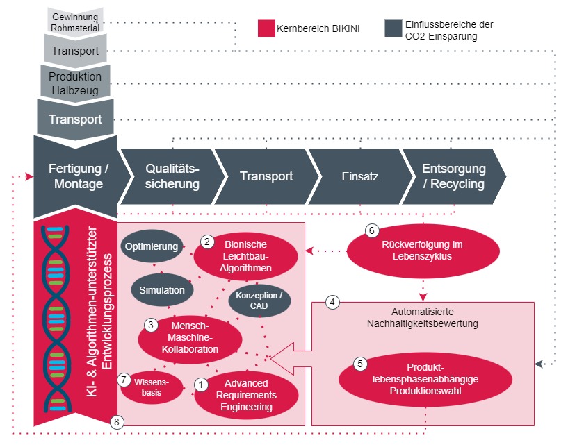 Im Forschungsprojekt BIKINI (Bionik und Kl zur nachhaltigen lntegration in der Produktentwicklung für einen ressourceneffizienten Leichtbau) wurden Leichtbautechnologien in Kombination mit Künstlicher Intelligenz (KI) mit dem Ziel eingesetzt, CO2-Emissionen einzusparen. Als entscheidender Hebel wurde dabei insbesondere die Gewichtsreduktion im Bereich der Mobilität gesehen. Die Reduktion von CO2-Emissionen wurde dabei ganzheitlich betrachtet, indem die oftmals CO2-intensiven Produktions- und Recyclingverfahren in die Betrachtung einbezogen wurden.